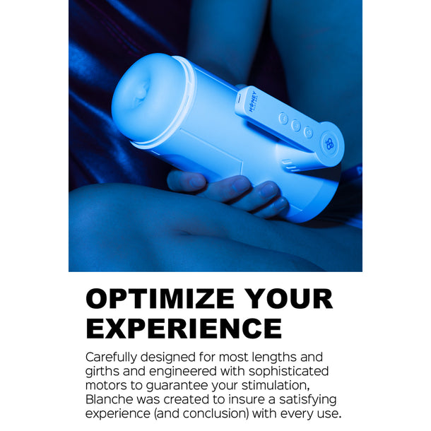 Blanche is a fully automatic thrusting stroker with extraordinary power for the real feel of penetrative sex. Experience intense sensations as the supple, stretchy sleeve wraps around your shaft, all while you grip the ergonomic handle with ease. Let Blanche do the thrusting while you sit back and feel the pleasure. Blanche is one of the most powerful automatic masturbators on the market.