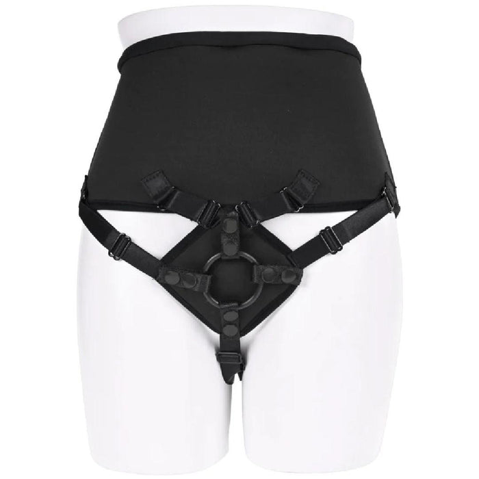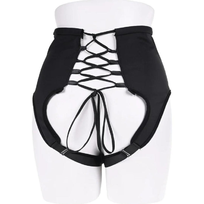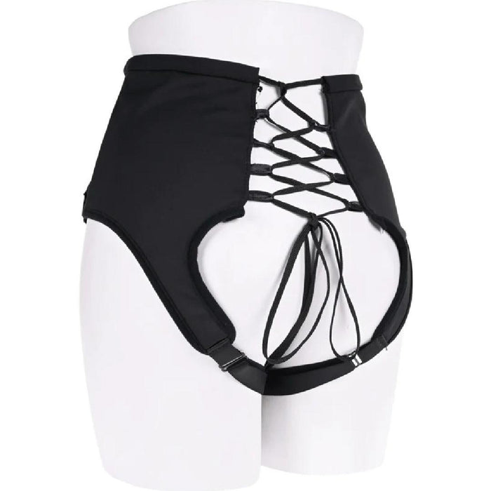 This stunning high-waisted corset harness hugs and accentuates your curves while giving you a commanding presence that will leave your partner trembling. Adjustable corset laces on the back let the soft, stretchy fabric conform perfectly to your body.
