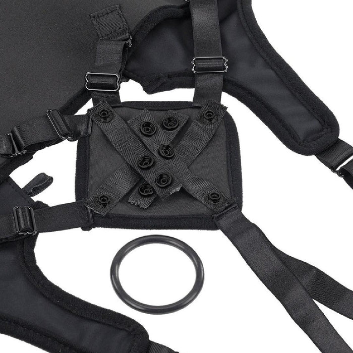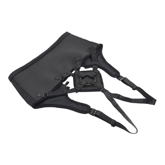 - Six adjustable elastic bands connect front padding for precise dildo placement